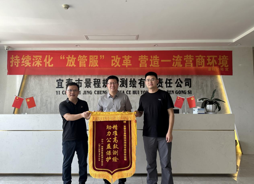 “高標(biāo)準(zhǔn)農(nóng)田領(lǐng)域行政公益訴訟專項(xiàng)監(jiān)督順利推進(jìn)取得實(shí)效,離不開景程公司的技術(shù)支撐與助力,為你們的測(cè)繪服務(wù)與企業(yè)擔(dān)當(dāng)點(diǎn)贊!”7月24日上午,宜春市檢察院第六檢察部一行三人來(lái)到市景程測(cè)繪公司,將一面印有“精準(zhǔn)高效測(cè)繪 助力公益保護(hù)”的錦旗送到了公司總經(jīng)理的手上,并表示誠(chéng)摯的感謝。