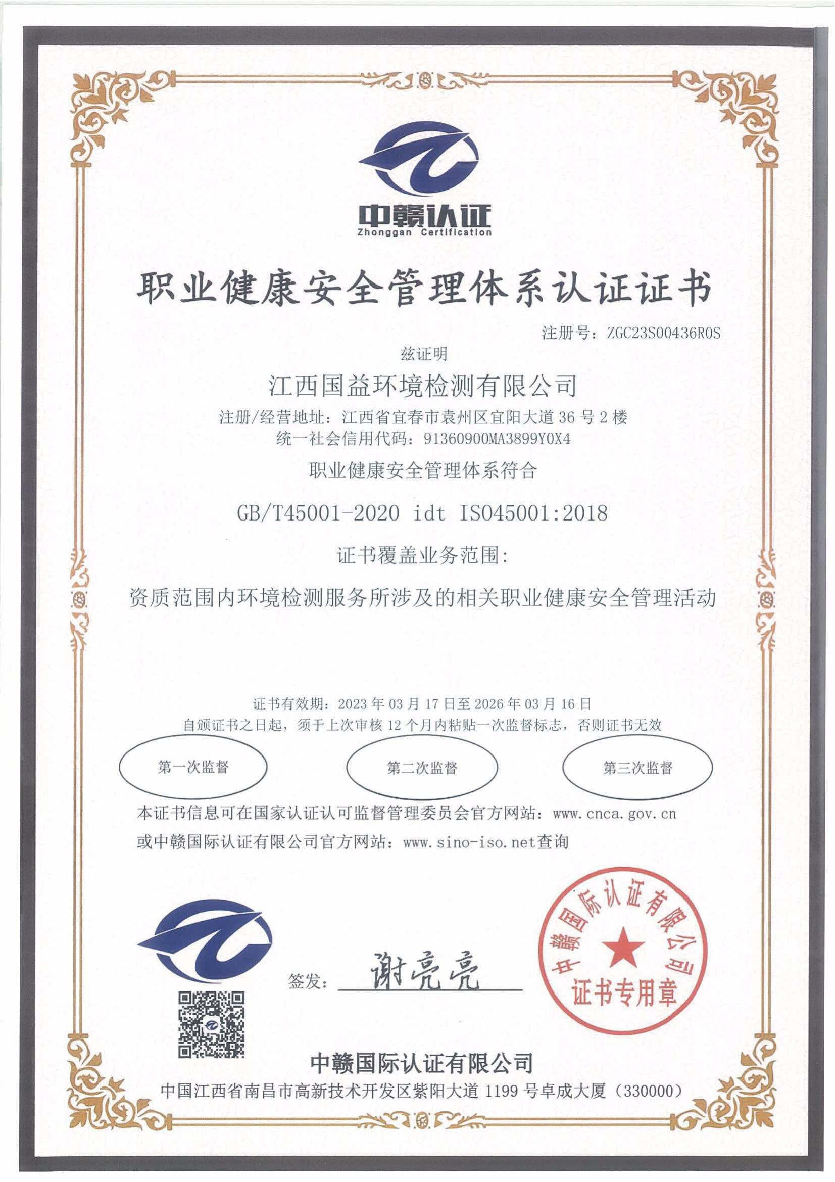 職業(yè)健康安全管理體系認(rèn)證證書