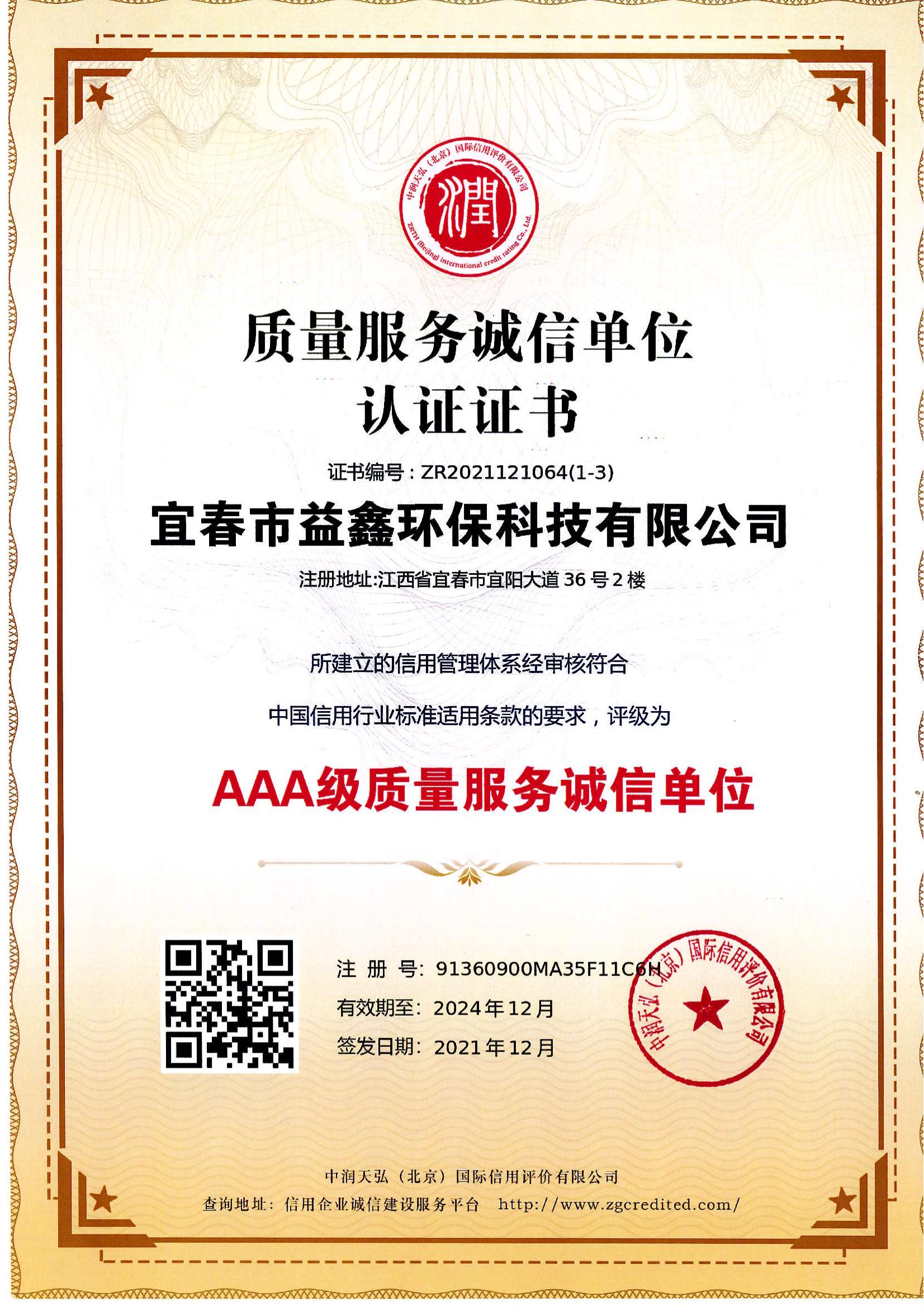 AAA級質(zhì)量服務(wù)誠信單位認(rèn)證證書
