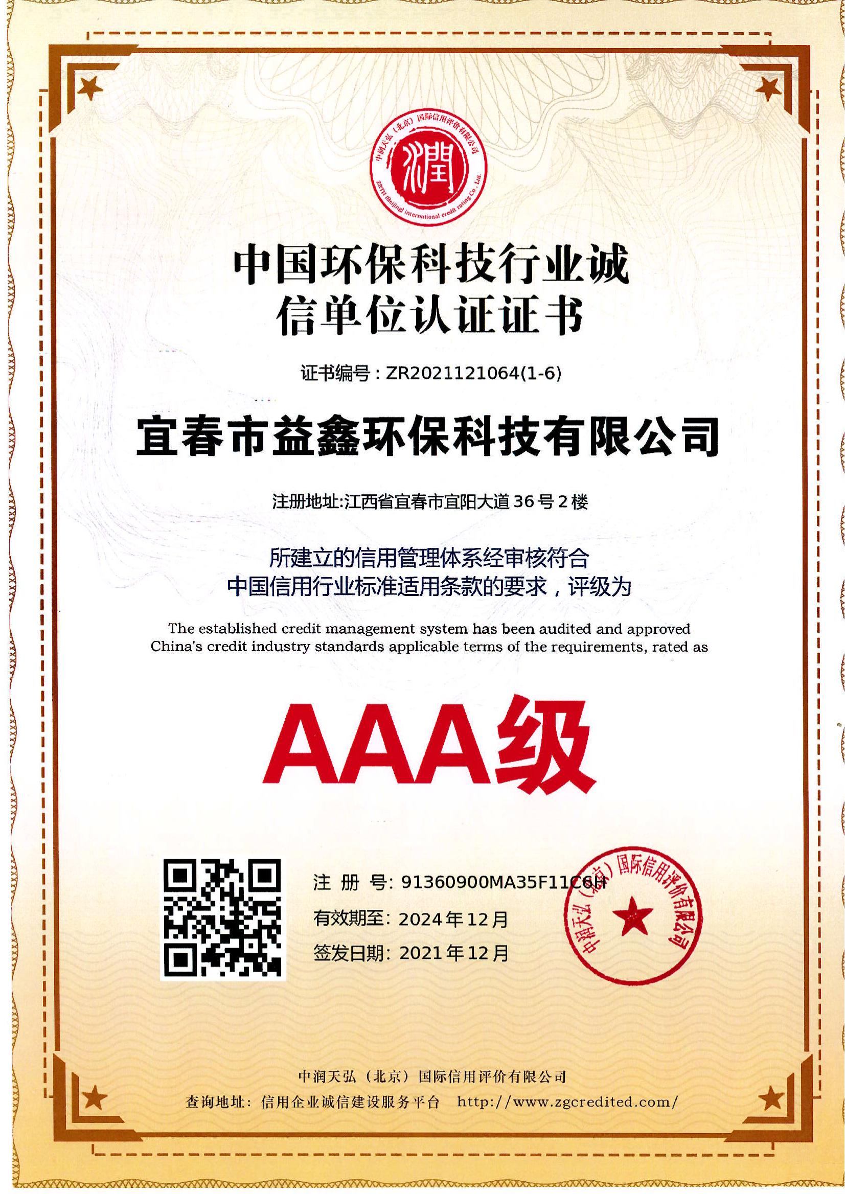 AAA級(jí)中國環(huán)保科技行業(yè)誠信單位認(rèn)證證書